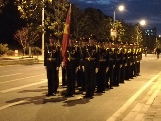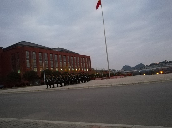 6:40國旗護(hù)衛(wèi)隊整隊完畢,護(hù)送五星紅旗入場。7:00,隨著“奏中華人民共和國國歌,升中華人民共和國國旗”的口令,旗手出旗、升旗,五星紅旗在空中迎風(fēng)飄揚(yáng)。全體師生行注目禮,奏唱國歌,表達(dá)對祖國的崇高敬意。