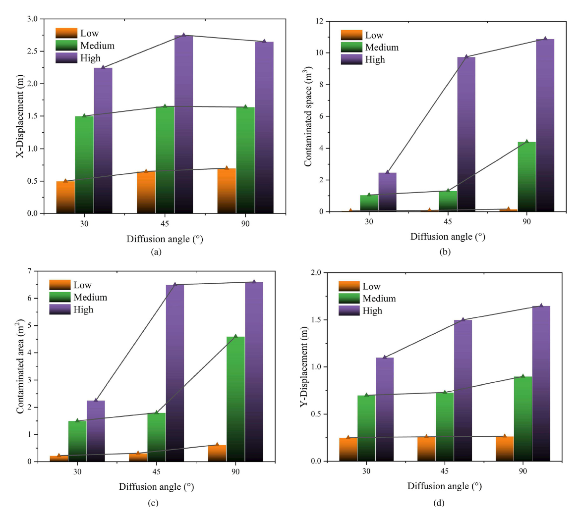 圖 15. 超聲波除垢儀的三種工作條件和三種初始擴散角的不同組合對手術(shù)過程中大液滴顆粒的空間流動特性的影響粒子的空間流動特性的影響。(a) 飛濺距離的變化 (b) 污染空間的變化 (c) 飛濺沉積面積的變化 (d) 飛濺高度的變化。