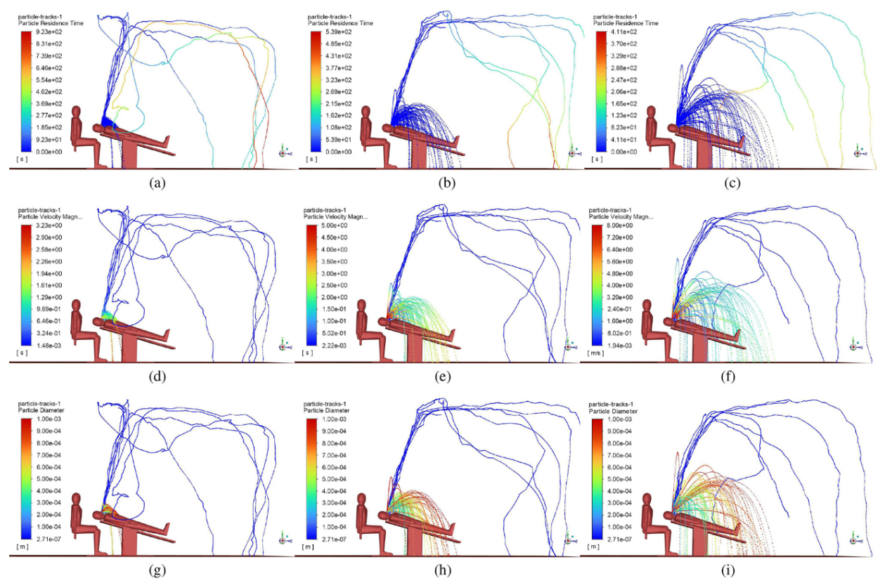 圖 3. 案例 7-9 分別模擬了在大初始噴射角下使用低、中、高功率引發(fā)的液滴流動。(a)-(c) 液滴顆粒在空氣中的停留時間;(d)-(f) 不同粒徑的液滴顆粒在空氣中的停留時間;(d)-(f) 不同粒徑液滴顆粒的速度分布;(g)-(i) 液滴顆粒的粒徑分布;