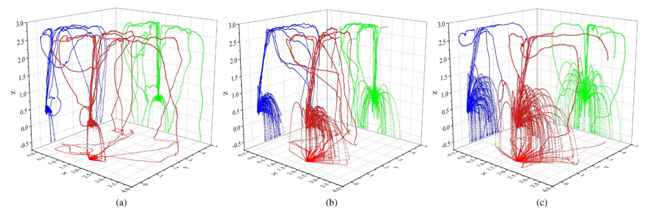 圖 4. 案例 7-9 分別模擬了在大初始噴射角下使用低、中、高功率引發(fā)的液滴流動。(a) 液滴的初始噴射速度為 2 米/秒、液滴的初始噴射角為 90;(b)液滴的初始噴射速度為 5m/s,液滴的初始噴射角為 90;以及(c)液滴的初始噴射速度為 8m/s,液滴的初始噴射角為 90。液滴的初始噴射角為 90;