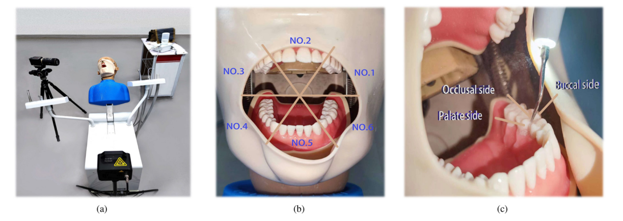 圖 1. (a) 實驗場景示意圖,包括粒子測速設(shè)備、人體模型和超聲波潔牙機;(b) 口腔牙齒分區(qū)示意圖,其中口腔內(nèi)的牙齒被分為六個主要區(qū)域;(c) 單顆牙齒分區(qū)示意圖,其中每顆牙齒被分為三個表面。(c) 單顆牙齒的分區(qū)圖,其中每顆牙齒分為三個表面、腭面、頰面和咬合面;