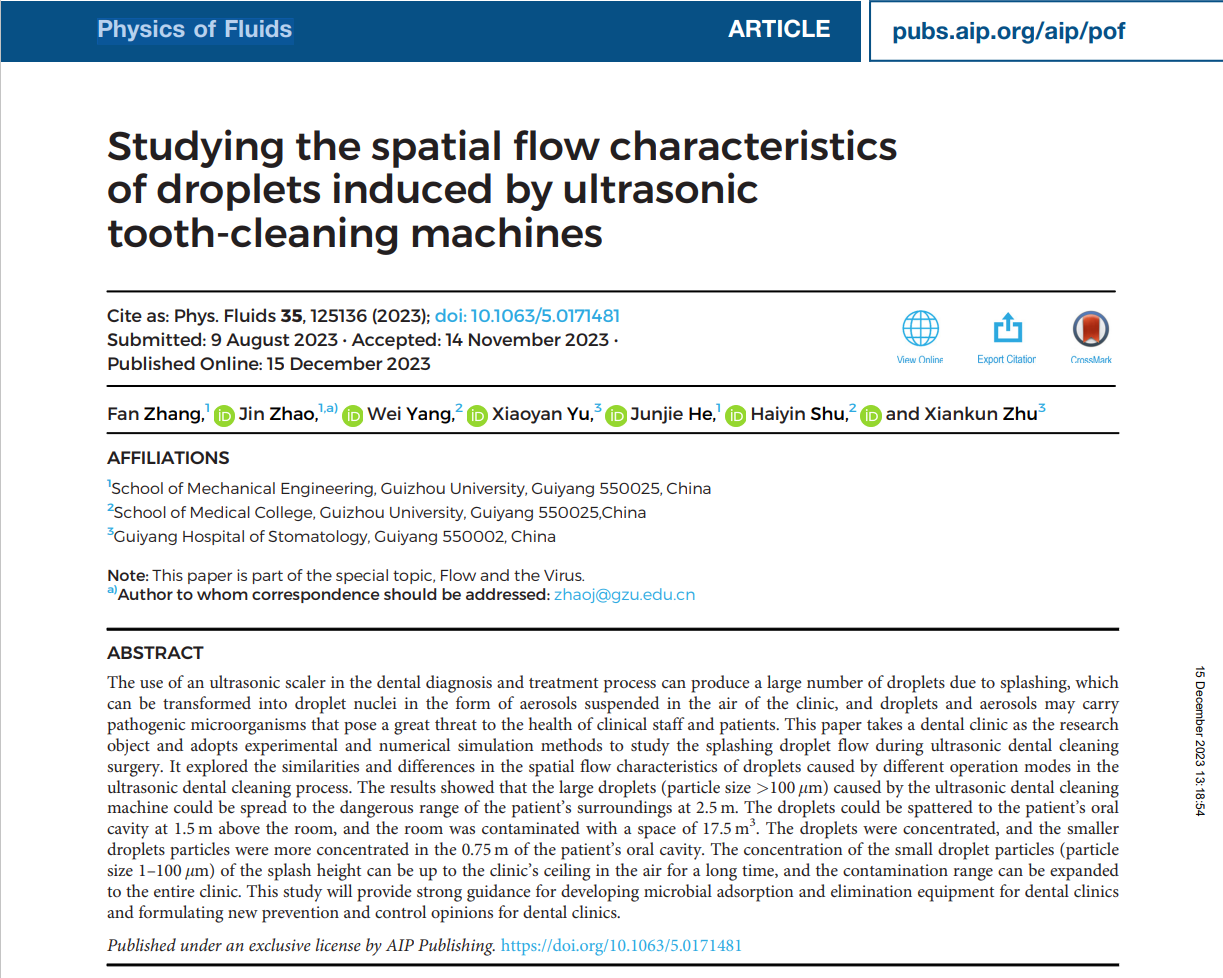 為解決上述關(guān)鍵科學問題,本課題組以某口腔診室為研究對象,采用PIV實驗結(jié)合CFD數(shù)值模擬方法對超聲潔牙手術(shù)中噴濺的飛沫流動進行研究。初步揭示了超聲潔牙過程中不同操作模式下所引發(fā)的飛沫流動特性,所獲得結(jié)果對研究其它類型的牙科手術(shù)引發(fā)的飛沫流動同樣具有借鑒意義,相關(guān)研究結(jié)果已發(fā)表在國際知名期刊《Physics of Fluids》上。