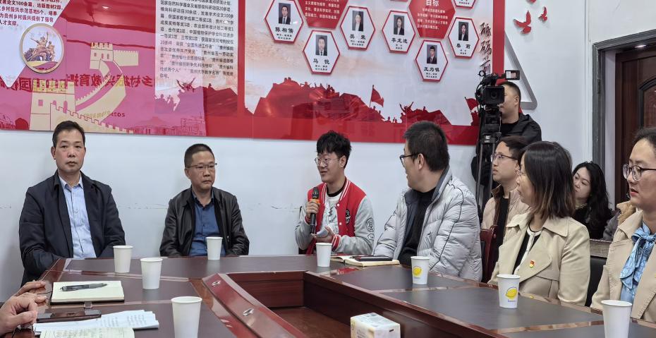 在“聽·一線故事”環(huán)節(jié),全體人員移步至農(nóng)場會議室。大家首先觀看了“全國模范教師”、機械工程學院張富貴教授的紀錄片《田間富貴》,并聆聽了張老師結(jié)合親身經(jīng)歷,講述如何將教育力量轉(zhuǎn)化為鄉(xiāng)村振興動能的感人故事;隨后,全國先進工作者、貴州大學教學實驗農(nóng)場副場長龍友華教授分享了自己如何通過科普活動和科技培訓,幫助村民了解新技術(shù)、掌握新技能,讓科技真正成為推動鄉(xiāng)村進步的強大引擎。隨后的“1+3”圓桌對談中,學生黨員聚焦“傳承與成長”、駐村隊員聚焦“實踐與賦能”、管理崗教師聚焦“協(xié)同與保障”,與張老師和龍老師展開了深入的思想碰撞與交流。