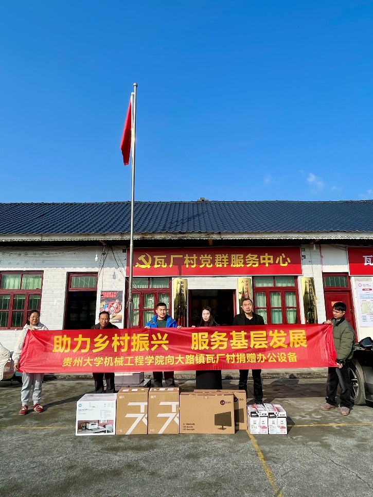 2026年1月6日,為進一步助力鄉(xiāng)村振興、服務(wù)基層發(fā)展,貴州大學(xué)機械工程學(xué)院向松桃苗族自治縣大路鎮(zhèn)瓦廠村捐贈了一批辦公設(shè)備,包括2臺電腦、1臺打印機及2箱A4打印紙,以實際行動支持當?shù)鼗鶎又卫砗袜l(xiāng)村發(fā)展。